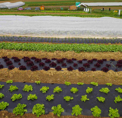 Nous préférons l’utilisation de paillages naturels, entièrement biodégradables en quelques mois (amidon de maïs ou de pomme de terre) pour les cultures annuelles et le binage des cultures pour entretenir le sol.